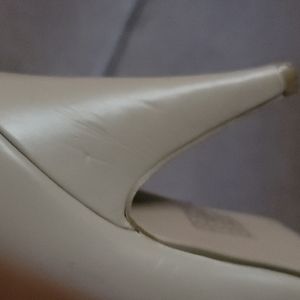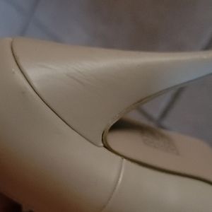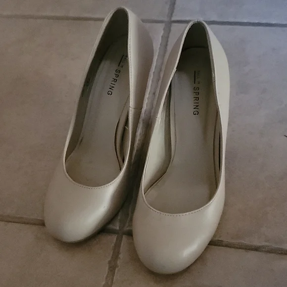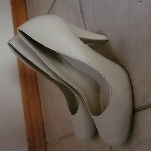 Beige heels in size 7 gently used. Small scuffs on the bottom of the platform. Few scratches to the heel.