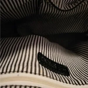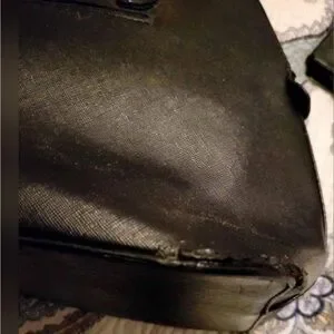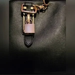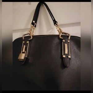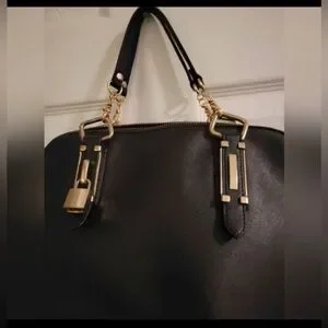 Pre-owned faux leather black satchel handbag. Features gold-toned hardware, including a padlock detail. Top handle and zipper closure. Minor wear and tear visible.