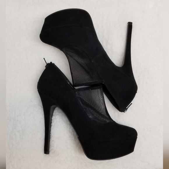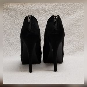 This pair from my collection(my closet🤣) is suede, with a black mesh on top and a zip closure at the back. Though the heel is pretty high these are fairly comfortable!