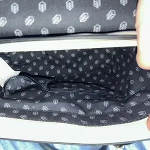 Zipper closure with flap. Inner pocket with zipper and then two smaller pockets on the other side. Gold hardware and comes with longer strap that can be made for over the shoulder or crossbody. She’s perfect.