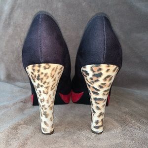 Black high heels with leopard print and red platforms. The print is faded a bit. A little scuffed on the front.