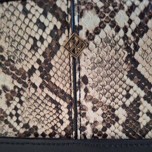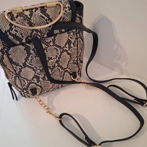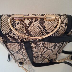 This is a genuine Call It Spring backpack featuring a stylish snake design. It has gold metal accents and two decorative zippers on the sides, adding a touch of elegance. The interior includes a secure zipper pocket and a convenient card holder for organization. Overall, it's in good condition and ready for a new home!