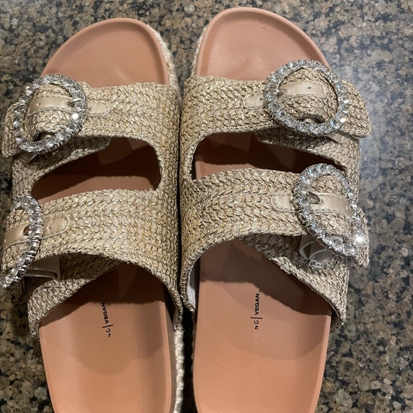 CLOSET ON VACATION UNTIL APRIL.......Closet going on vacation and I can''t ship past Dec 24th. Step out in style with these chic tan sandals featuring sparkling rhinestone buckles. Perfect for any casual outing. They photographed a bit dark, they are clean and in perfect shape. I only wore once. I'm not fancy like this lol. Great for those going somewhere warm. Smoke free clean home.