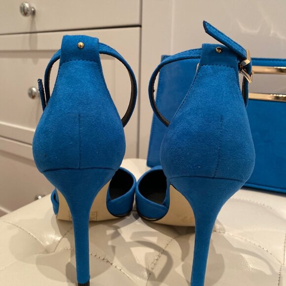 Call it Spring azure blue closed toe high heel shoes with ankle strap. Vegan suede. Size 7.5 Never been worn!