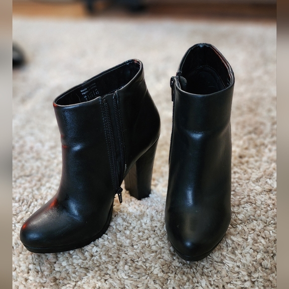 Call it Spring booties. 4" heel, leather. size 7. Gently used. Small scuff on wide of one bootie, another small scuff on the heel of the other.