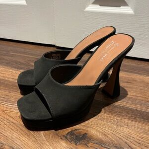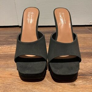 Call it Spring black platform sandals. Flared heel approx. height 3.5 inches. Cushioned foam insoles. New without tags, never worn. Size 8.