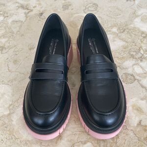 You'll love the comfort and style of these super modish casual shoes from Call It Spring. The Pariss has a black vegan leather upper with a penny loafers style, chunky platform some in pink, adds a touch of fun and lightness.
