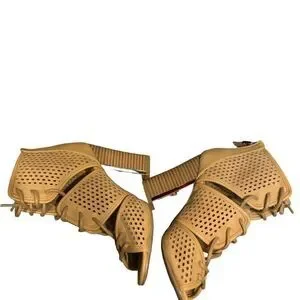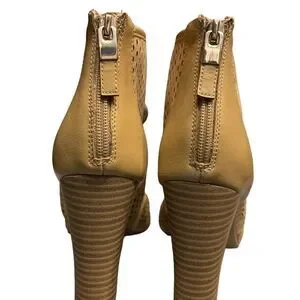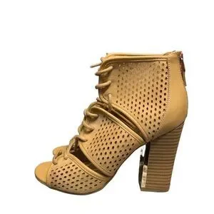 Call It Spring Perforated lace up booties in almost new condition has next to no wear if any. Has an open toe concept and is faux leather feel. Has a zipped back and a metallic inside heel for an added touch very on trend comes in a nice shade of tan. Not nibble wear to mention only worn once or twice.