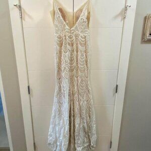 This beautiful lace dress with ivory/nude has only been worn once. Lace detailing complimented with a not too long train make this a perfect dress for an outdoor wedding.