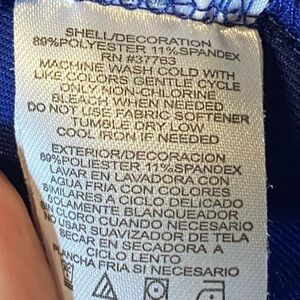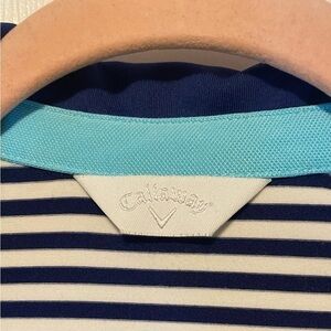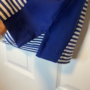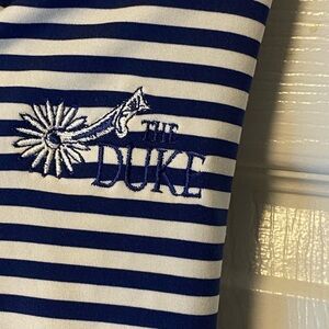 Great golf shirt, navy and white strip, with blue side panels. Sleeve appliqué “The Duke”, also with side slits in hem, constructed of polyester/spandex in GUC