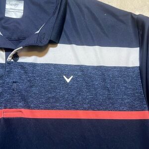 Stylish Callaway men's polo shirt. Features black and gray with a striking red stripe. Perfect for casual or sporty occasions.