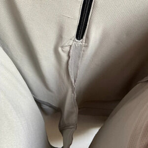 Back zipper, 2 side pockets with built in skirt. Comfortable elastic waist band.