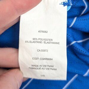 This polo shirt by Callaway is made of a polyester/elastane blend (95/5) and is a rich blue with thin white stripes. The shirt has short sleeves, a solid-tone colour, a 3 button opening at the neck, and small slits at the bottom sides of the shirt. The fabric is lightweight and has small airholes for ventilation (see pic 4). The outer left arm says, "Callaway" and there is a small white logo on the front left chest. The shirt has normal wear, but no issues affecting wearability.