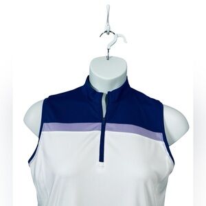 Stay cool and stylish on the course with this Callaway women’s mock neck sleeveless golf polo. Designed with Opti-Dri moisture-wicking fabric, it helps keep you dry and comfortable during every swing. Featuring a half-zip front, contrast navy and lilac color-block panel, and a classic mock collar for a modern sporty look.