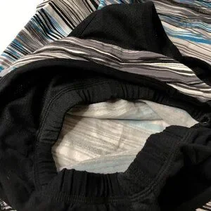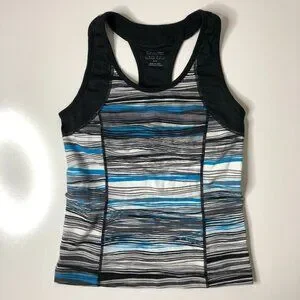 Calvin Klein Performance Quick Dry racerback tank top with blue, grey, black and white stripe like design in an abstract striped pattern. It has a racerback design (see pictures) and a built in bra with elastic on the bottom of the bra. In great used condition with no flaws and is comfy due to the stretch. Has never been put in the dryer. Please see photos for details. Women’s size SMALL.