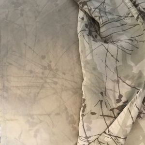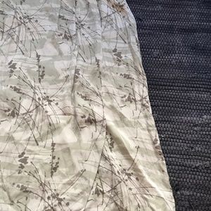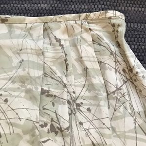 Beautiful faux wrap skirt in a muted graphics print. Pleat detailing at by wrap, lined in back, zipper/hook closure. 100% Silk, with rayon lining. In very good used condition.