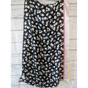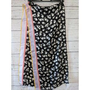 Design: black white scarf with floral design , contrast stripe on one side , short fringe, logo