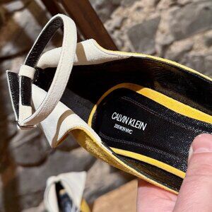 Part of the runway collection. Vibrant yellow suede. Open foot design with a single strap at toes, a contrasting white ankle strap with buckle closure, and a white flap detail at the back. Cone heels. Made in Italy. They come with a Calvin Klein 205W39NYC dustbags.