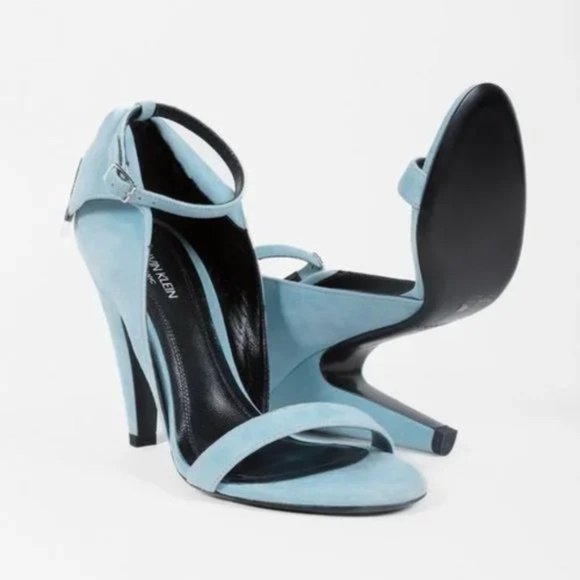 From the 205W39NYC runway — crafted from kidskin in blue suede, the Letitia sandals from Calvin Klein feature a rounded toe with a thin strap at the vamp, black leather lining, an adjustable ankle strap, a covered stiletto heel, a silver-tone metal tip at the fold-down heel collar, and black leather soles.