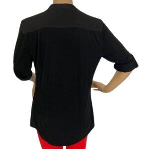 Sleek, polished, and effortlessly versatile, this Calvin Klein Black Blouse is a wardrobe staple with a modern edge. Designed with a flattering V-neckline and a high-low hemline, it drapes beautifully for a silhouette that’s both relaxed and refined. The blouse features adjustable sleeves for customizable styling, along with functional front pockets accented in a contrast subtle shimmer fabric that also highlights the neckline and shoulders—adding just the right amount of subtle shine. Pairs perfectly with tailored trousers for a work-ready look, or style it with skinny jeans or a leather skirt for a night out. From desk to dinner, this blouse brings elevated ease to any outfit.