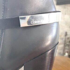 Sleek and edgy, Calvin Klein ankle boot. The winding strap detail boasts metallic accents to incorporate shine into this sleek look. Very gently worn, less then half a dozen times, this ankle boot is very stylish and can be dressed up or down. True to size; 7 1/2M, 4" chunky heel.
