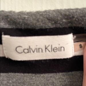 Sophisticated asymmetrical dress by Calvin Klein. Features bold black and gray stripes. Perfect for versatile styling.