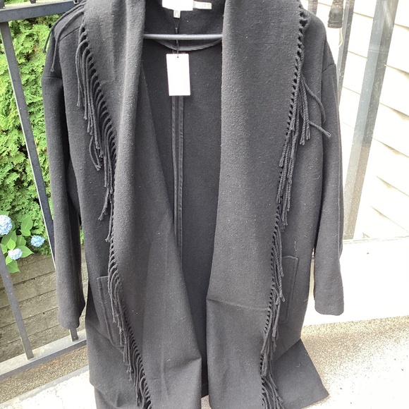 Gorgeous statement relaxed fit quality fringed coat with 2 patch pockets. Statement Fringing all around the opening of the coat and around the collar. It’s a fabulous and stylish very flexible open coat. You can dress this coat up or down!