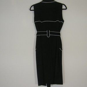 This Calvin Klein front buttoned sleeveless dress is black trimmed out in white. Contains front pockets and is fully lined. Made of 67% polyester, 33% Rayon and 3% Spandex.
