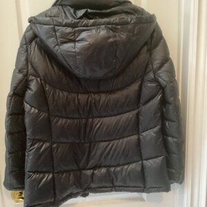 Looking for a lightweight, yet cozy jacket you can fold away in your luggage - here is the jacket for you! Black premium down hooded jacket with gold coloured zipper; 2 outer pockets and 2 inner pockets. Worn a couple of times - next to brand new!