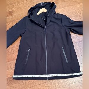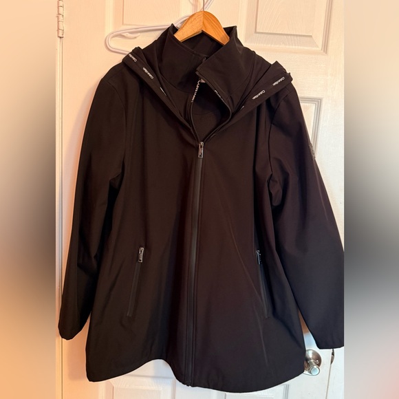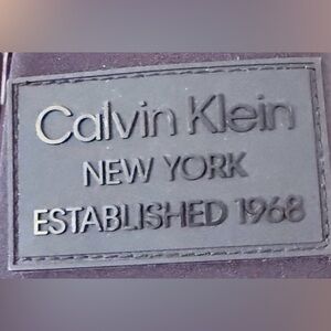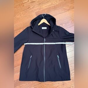 Calvin Klein jacket with prominent logo patch. Streamlined silhouette and minimalist styling. Smooth black fabric and tonal patch detail.