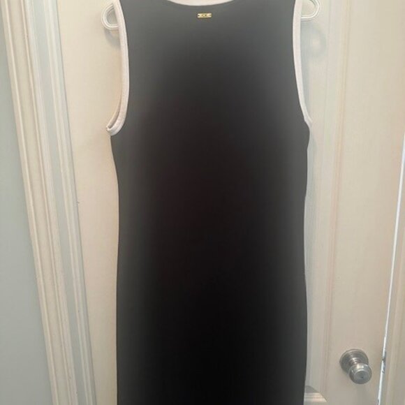 'Simple and elegant Black stretch sheath with white trim. Side slits make for ease of wear. Dress is full length on me and I am 5'8