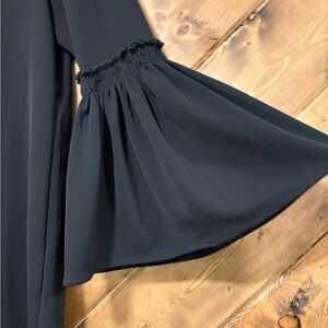 This elegant black top is perfect for any occasion. Its sleek design and comfortable fit make it a versatile addition to your wardrobe. Bell sleeves, gold accent. Gold accent has scratches.