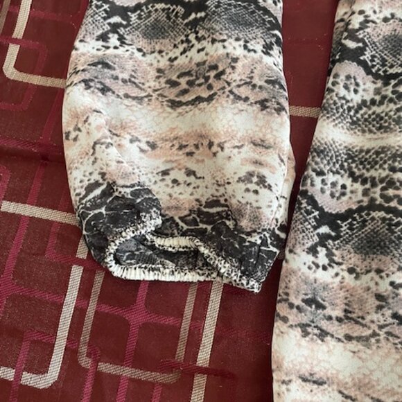 Calvin Klein Black/White/Rose Long Sleeves Blouse Size M/L - black, white, light Rose multi pattern design long sleeve top, opaque sheer material - 100% polyester, “V” neck with jewelry bar to connect the overlapping front together - blousy fit – elastic at sleeves and hem - generously covers any “flaws” – light weight – looks good worn with pants/capris or a skirt - can be worn year round - measurements from under the arms , 19” across chest, sleeve length 23”, , back length from neck to hemline is 25” front length from neckline to hem 19 “ - smoke/pet free home