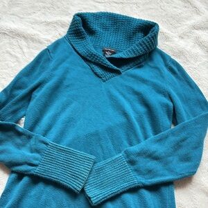 This is a cozy long-sleeve teal sweater featuring a unique waffle-knit cowl neck and matching wide ribbed cuffs for added texture and warmth. The tunic-length design provides extra coverage, making it great for pairing with leggings or skinny jeans. The soft fabric offers comfort for cooler weather, and subtle ruching detail on the side hem adds a flattering touch to the relaxed silhouette. Perfect for casual days or laid-back evenings with a stylish, comfortable vibe.