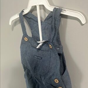These Calvin Klein blue overalls feature a relaxed fit and adjustable shoulder straps, offering both style and comfort. Crafted from a soft, lightweight fabric, they are perfect for casual outings. 6-9 months