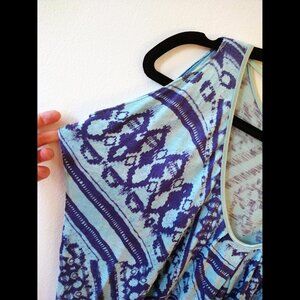 Lightweight, comfortable Calvin Klein dress. Cute cold shoulder sleeve detail, drop waist. Unique blue-on-blue pattern. In great shape.