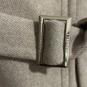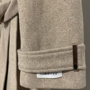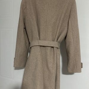 Fancy trench coat made with wool fabric, beige/tan in colour, size 14, long belt with buckle, never worn, good for cooler temperatures. Brown interior.