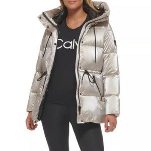 New with tags/never worn Calvin Klein "Shine" hooded quilted puffer jacket. A gorgeous winter coat in a shiny metallic material. The manufacturer's colour is "smokey taupe" (silver-grey with a hint of taupe/tan and black lining) featuring drawcord waist & hood, zippered & snap front closure, side zippered pockets & 1 inner zippered pocket, and Calvin Klein patch on left arm. Shell & lining are 100% Nylon with 100% Sorona Polyester filling (partially plant-based, lightweight, & breathable material). Machine wash & dry. Size XS Laid flat approximate measurements: