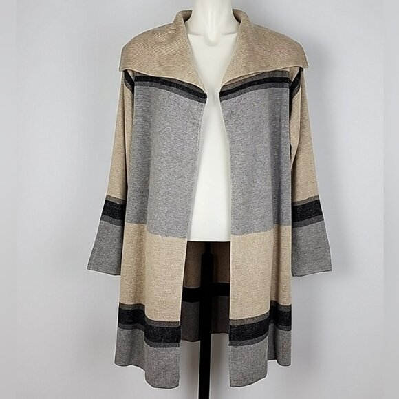 Calvin Klein Colorblock Tan Grey Open Front Long Knit Cardigan Wide Collar Sz S