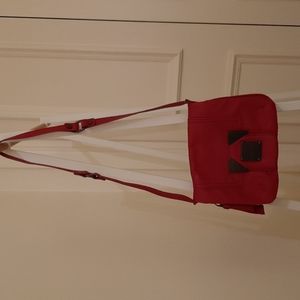 Calvin Klein - Red leather bad with multiple compartments inside. Silver metallic accessories in the front. Medium length handle. In great condition.