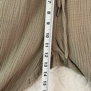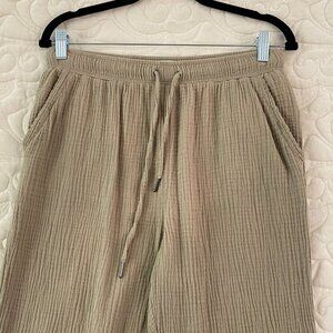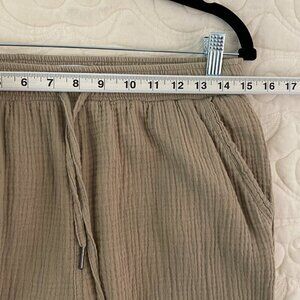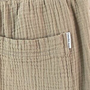 Calvin Klein Pants. Women's tag size Medium (actual measurements in photos - taken un-stretched). 100% cotton. Crinkle fabric. No stretch except waist. Beige. Gathered elastic waist with drawstring. Front and back pockets. Relaxed fit.
