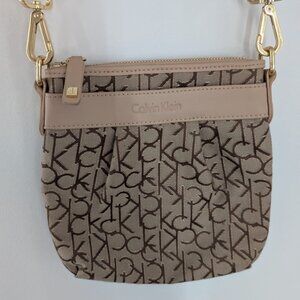 Calvin Klein Crossbody Bag in excellent condition. Tan colour with gold accents. Plenty of space inside to hold phone, wallet, headphones, lip balm, etc. Comfortable pad for shoulder. Inner zip pocket and outer magnetic button pocket + main pocket.