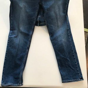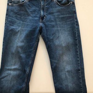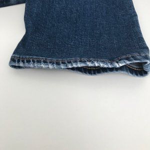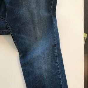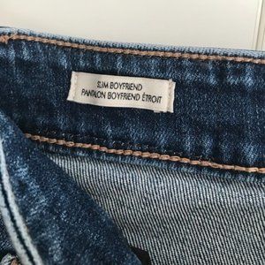 Medium wash, soft, gently worn, relaxed fit, distressed 5-pocket slim boyfriend jeans. The bottom of the legs are slightly worn but still in excellent condition.