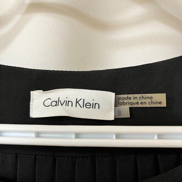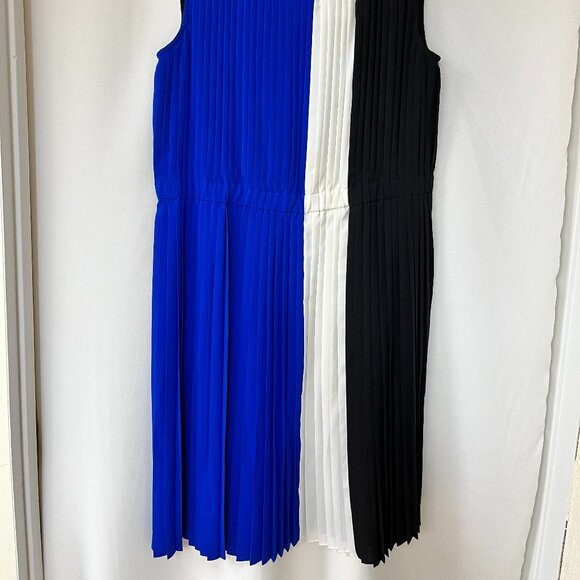Calvin Klein Dress. Blue, white, and black colours, has a pleated design. High neckline and knee length. Size 8 Women's. Brand new, worn twice and is dry cleaned.