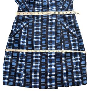 Features: Epaulets at shoulders, A-line silhouette, mini length, reversable tie belt, can be worn belted or unbelted, two front flapped expandable pockets at chest, two roomy welt pockets on hips placed on the diagonal, bold abstract print, branded throughout (buttons, back zipper pull, exposed zipper at back, enlarged kick pleat at back, some stretch to fabric
