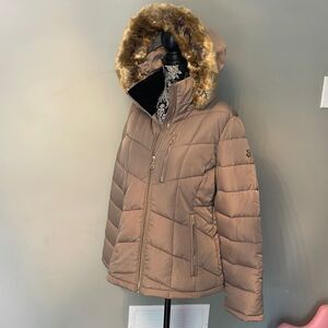 Calvin Klein Faux Fur-Trim Short Puffer Coat. Tan