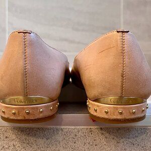 calvin klein, ballet flats, flats, short heels, small heels, tan color, light skin color, studs, studded, round toe, b uisness casual, office, classic, slip ons, designer, preppy