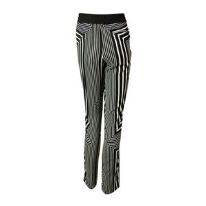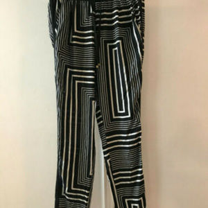 Fantastic Black and White Geometric print with tuxedo stripe down side of each leg. Super light 100% Rayon fabric with Polyester trims.