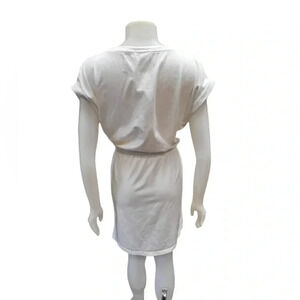 A short sleeve, this athletic style dress is white with graffiti style call out. The waist is elasticized and there are two flat pockets. The sleeves are rolled and the neck is round. It's a mini and perfect summer or vacation dress.