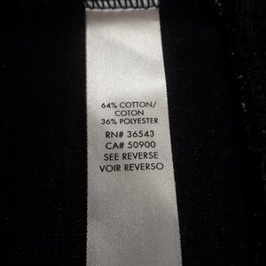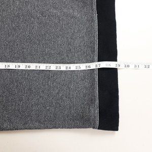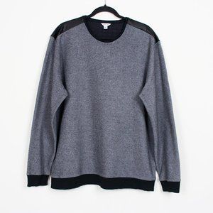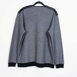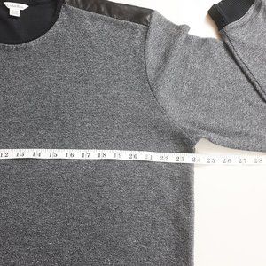 A two-tone pullover sweater in a black and grey shade. This crew neck design has contrasting black faux leather panels on the shoulders. It also includes contrasting rib knit on the neckline, cuffs and hem. Perfect for spring, fall and winter. Great condition.